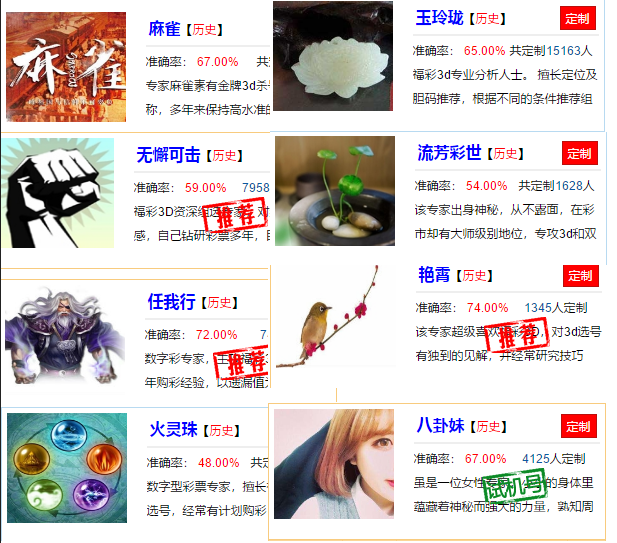 而且我们采取的也是自主定制,将专家们都分门别类了。各个种类下面都有很多专家在,这样就给彩民们提供了更多的选择,无论是胆码还是杀码,直选还是组选,定位还是形态,全部都有专家帮你精准预测。所以在选择的时候,可以根据自己的所需,来挑选适合自己定制的专家。而且定制的方式也非常简单,看中哪个专家,直接选择定制就好。