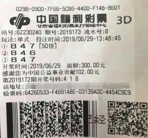 7月2日上午,中奖彩民来到武威市福彩中心领取奖金。据了解,王先生是地地道道的福彩忠粉,彩龄已经有好几个年头。他最喜欢投注的就是双色球和3D游戏,基本每期都会购买。说起投注方法,他略显腼腆的说到:“一是看分布图,二是凭自己感觉,只要是自己选中的号码,加上感觉良好时便会进行多倍投注。”王先生投注号码从来不犹豫,此次中奖号码就是结合上一期的开奖号和往期的中奖号码分析,边看边在纸上写下看好的“8 4 6 ”和“8 4 7 ”,为了证明自己的想法,也为了给自己一个中大奖的机会,分别对两组号码进行了倍投。当晚3D游戏果真开出奖号“8 4 6”,王先生幸运击中大奖5.2万元。