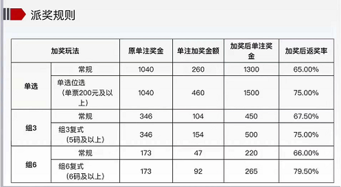 与以往的派奖活动相比,本次派奖将游戏的最高返奖率提升至79.5%,为历史最高,是真正的惠民盛宴。其中,3D游戏的单选玩法加奖后单注奖金最高1500元,返奖率高达75%;组3玩法加奖后单注最高奖金500元,返奖率高达75%;组6玩法加奖后单注最高奖金达265元,返奖率高达79.5%。