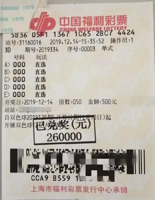 而值得一提的是,于先生的中奖彩票并不是在同一家站点买的,他先是在盈港路福彩销售点买了2张直选5注50倍的彩票,之后又在卫中路福彩销售点买了一张直选5注99倍的票。而正是这多买的一张彩票,让他多收获了五十多万大奖!