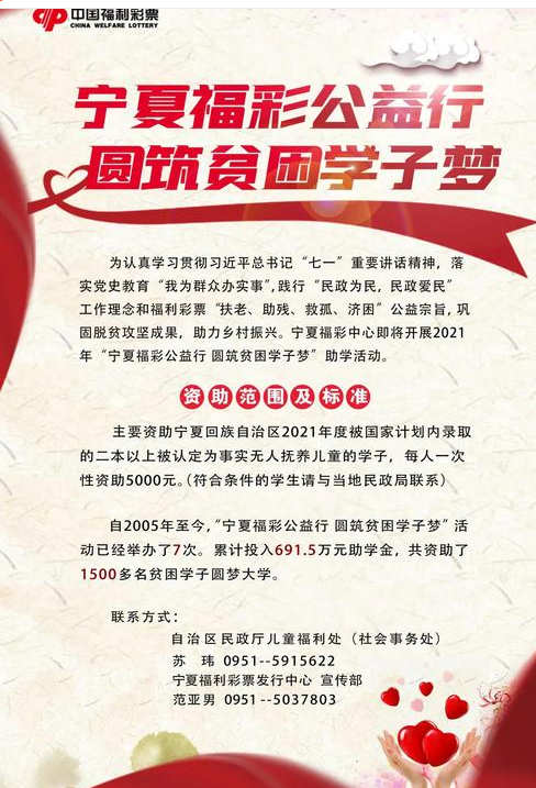 在自治区财政厅的大力支持下,宁夏福彩中心拟于近期开展2021年“宁夏福彩公益行 圆筑贫困学子梦”助学活动,计划出资50万元,资助全自治区2021年度被国家计划内录取的二本以上被认定为事实无人抚养儿童的学子,每人一次性资助5000元。本次助学活动由自治区民政厅儿童福利处(社会事务处)联合全区相关市县民政局组织实施。