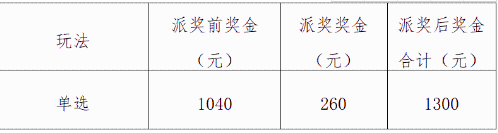 对3D游戏单选玩法固定派奖260元。单选中奖奖金将在原有基础上派奖260元,派奖后单选玩法单注奖金合计为1300元。