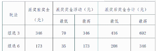 每期派奖奖金由当期组选3或组选6中奖者均分,每注派奖奖金按元取整,小数点后部分进入调节基金。每注派奖奖金实行保底和封顶限制。组选3每注最低加派70元,最高加派346元;组选6每注最低加派35元,最高加派173元。即派奖后,组选3单注奖金最低为416元,最高为692元;组选6单注奖金最低为208元,最高为346元。