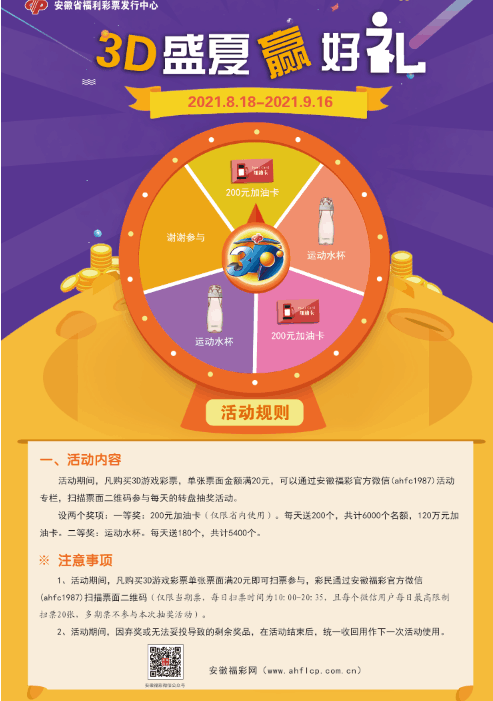 按照安排,活动期间,凡购买3D单张票面金额满20元及以上的,可以通过安徽福彩官方微信公众号(微信搜索“安徽福彩”或“ahfc1987”)活动专栏,扫描彩票票面二维码参与每天的转盘抽奖活动。活动设两个奖项,其中一等奖是200元加油卡(仅限省内使用),每天送出200个,共计6000个名额;二等奖是运动水杯,每天送出180个,共计5400个。