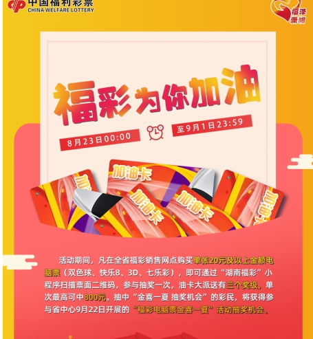 为回馈广大彩民对福彩电脑票的支持和喜爱,湖南福彩将于8月23日00:00至9月1日23:59开展为期10天的“福彩为你加油”营销活动。