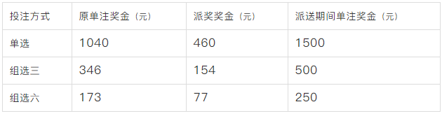 活动期间,以“单选”、“组选3”、“组选6”方式购买3D游戏彩票,中奖奖金进行如下派送: