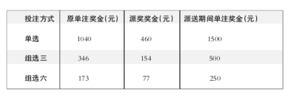 活动期间,以“单选”“组选3”“组选6”方式购买3D游戏彩票,中奖奖金进行如下派送: