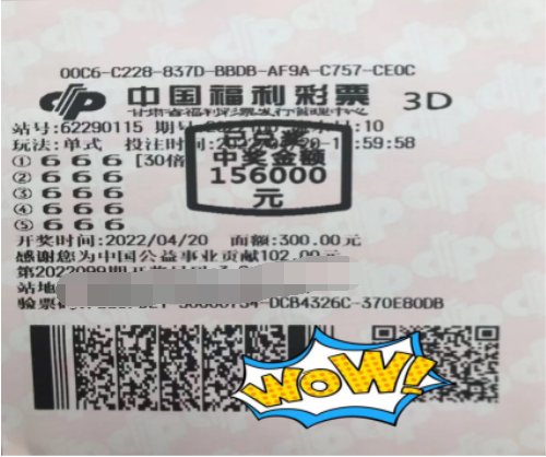 4月20日,福彩3D游戏进行第2022100期开奖,当期开奖号码为“6、6、6”,是难得一见的炸弹号。临夏一彩民喜中单选150注,收获奖金15.6万元,该彩票出自临夏州临夏市投注站。