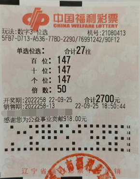 9月25日,福彩3D游戏第2022258期开奖,当期开奖号码是“147”。位于营口市鲅鱼圈区彩站中出50倍单选位选共27注,获得奖金52000元。