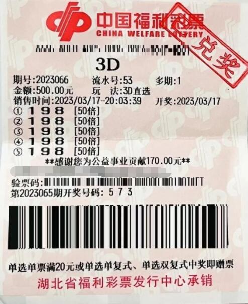 当晚3D第2023066期开奖,号码正好是“198”。