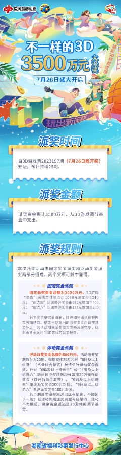 缤纷夏日,花香四溢,美好生活,快乐开启,湖南福彩于7月26日开展3D游戏3500万元大派奖活动!作为湖南3D派奖史上力度最大的一次活动,开启“宠粉”模式,将带给购彩者不一样的体验感。