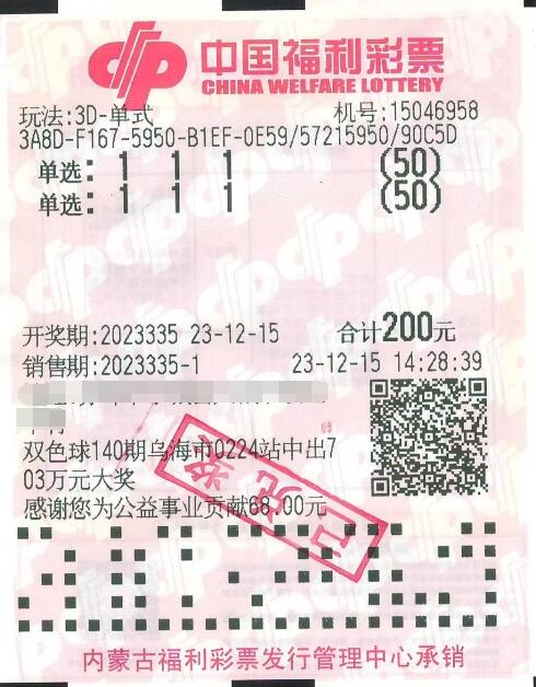 据了解,李先生(化名)是一位老彩民,购彩已经近10年时间,最喜欢的就是福彩3D游戏,几乎期期都会购买,去年还中过一些奖。平时不论是工作闲暇,还是出差办事,有时间总会买几注3D。12月15日这天,李先生来到宁城县福彩销售站,和几个关系不错的彩民聊了几句后,看了看3D近期开奖号码,觉得豹子号码“111”不错,于是就投注了100倍,当期开奖结果出来,李先生选中的号码共计中得奖金104000元。“虽然这不是第一次中奖,但心里还是有点激动,回家后要好好庆祝一下,也希望更多的朋友收获好运!”兑奖后李先生说道。