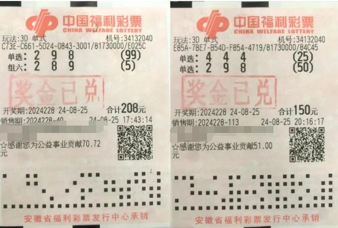 8月25日,3D游戏开奖号码为:2,9,8,六安市销售网点一彩民,以149倍单选投注和5倍组六投注一举中得奖金155825元。