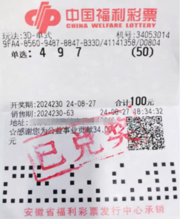 8月27日,3D游戏2024230期开奖,中奖号码4、9、7。马鞍山一彩民中得3D游戏单选大奖50注,奖金合计52000元。