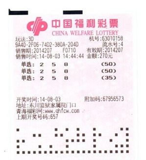 两个月前我研究走势图,按自己的选号方法选出了近期内没有出现过得号码,可是看了几组号码感觉都不太好,思来想去还是决定选择自己的幸运号258。晚上聚会完回到家,看时间3D的开奖号已经出来了,我就用手机上网查了一下,发现中奖号码正是自己的幸运号码258,当时开心极了。