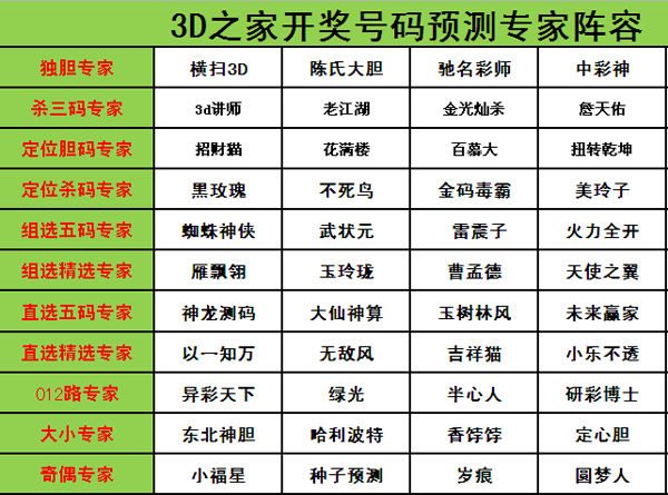 上面这张图就是我们3D之家的部分专家了,在这里有不同类型的预测专家,有定胆专家、杀号专家、定位专家等等,各个专家都是身怀绝技的。想要知道他们究竟有多神奇吗?快快点击3D专家预测,了解更多详情吧。