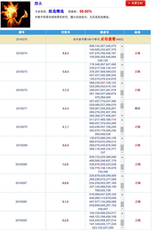 近期的战绩中,烈火更是表现出色,十期中了九期,整体的准确率达到了60%的高度,在这个领域里面,这个准确率可谓是非常的高了。