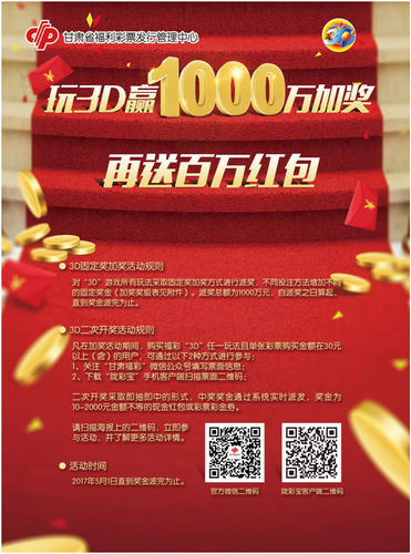 2、 凡购买“3D”任一玩法且单张彩票购买金额在30元以上(含)的用户,还能参加百万元的扫票面二维码抢红包活动。