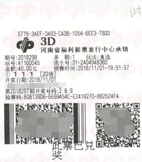 11月1日,福彩3D第2018298期开奖,开奖号码“111”。济源一彩民凭借20倍的直选投注,斩获3D大奖两万余元!实在是高手中的高手,令人羡慕。
