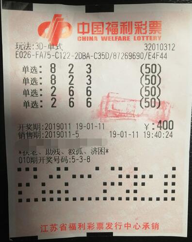 1月11日,南京彩民赵大姐收获了福彩3D奖金104000元,当期的开奖号码为“266”。