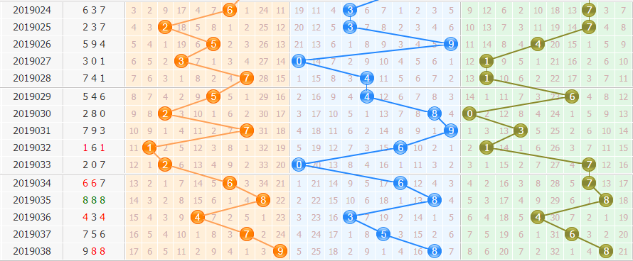 上期开出988,和值25,1奇2偶,全大,百位9遗漏24期、十位8遗漏2期,个位8遗漏2期,从整个出号来说,总遗漏值达到28期,说明有较热的号出现。而除3余数形态022路。