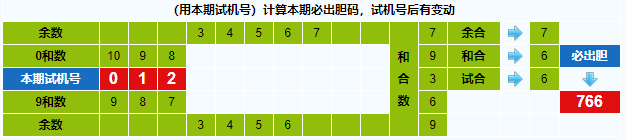 本期胆码计算器与试机号没有重合的号码。结合近期试机号命中开奖号走势图来看,试机号已经连续五期命中开奖号了,这样高的命中几率是比较少见的,所以本期继续命中开奖号的可能性不是非常大,所以可以对试机号稍作排除。