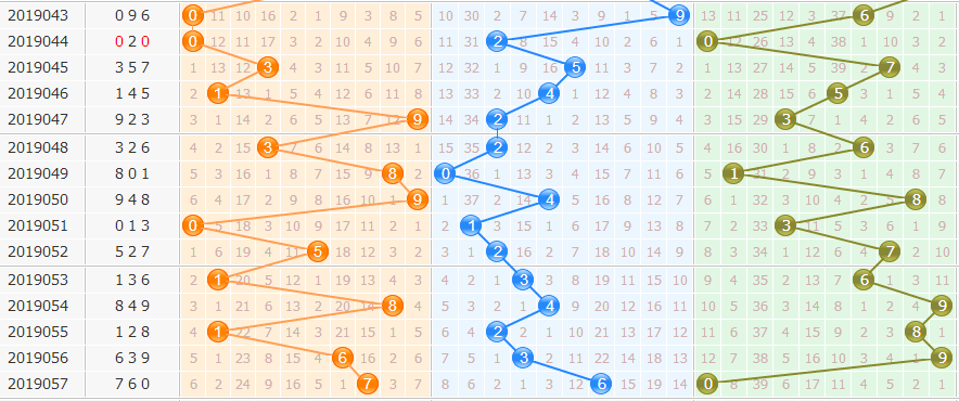 从近50期看,开出7有10次。到5、4有2次,到2、6、1、9有1次,重复1次。我们从“遗漏表”中得出。首先排除1路的号,再排遗漏期数多的2、3,几率小的6、8,本期选择0、5、8。
