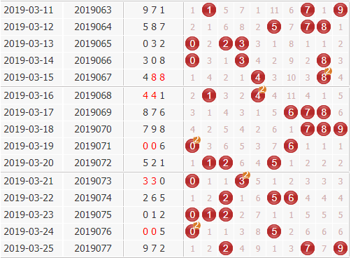 上期的开奖号码是972,和值是18,和尾是8,开出了偶数和尾,在4期偶数和尾之后是开出了3期奇数和尾,然后是转为偶数和尾,根据这样的一个走势,078期继续看好偶数和尾的开出,近期预计会持续开出偶数和尾。078期和尾推荐:0 2 4 6。