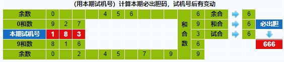 本期胆码计算器与试机号没有重合的号码。本期胆码计算器出现了豹子号6,6号球在近期是个持续走冷的号码,发展趋势不是很好。而且,尽管试机号6出现的频率不低,但是在长达四十期中,都没有试机号6命中开奖号的记录。所以本期胆码计算器开出的6号球,需要细细斟酌,不建议盲目跟号。