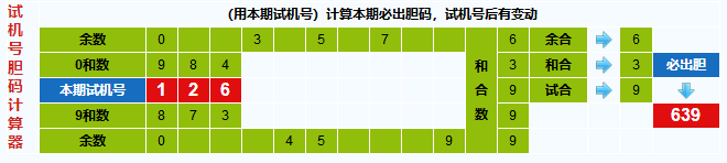 今日3d试机号的开奖号码是126,试机号胆码计算器开出看了639,从试机号跟试机号胆码计算器来看,都有1个6,6号球目前是隔了4期,上一次的6号球是在隔了3期的时候开出来的,本期有开出的几率,需要关注;1号球是一个隔期号码,上一次也是在隔期的时候开出来的,所以需要关注;2号球跟9号球都是隔了2期的还没,从走势上来看,近2期都有开出隔了2期的号码,所以本期隔了2期的号码需要关注;3号球是上期的开奖号码,重复号本期防一下就好了。