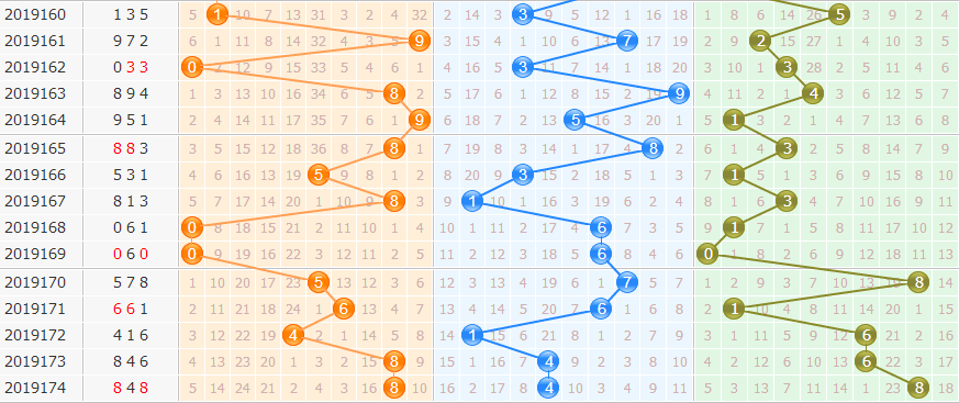 和值预测:和值上期开出20,近两期的和值走势开始往中大走, 参考近期的号码走势分析,本期比较看好出号位置小幅度的左移,看好中段位置和值走势,苏会文本期重点推荐和值:10 11 15 16 18