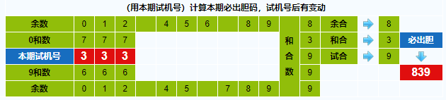 本期胆码计算器与试机号重合一个号码3。结合近期试机号命中开奖号走势图来看,3号球在近期的势态提升明显,接连在试机号或开奖号中出现。而且,试机号3在近二十期中都没有命中过开奖号,本期很有可能出现转机,看好3号球开出。