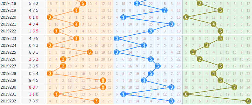 【和值分析】:和值上期开出了24,大和值开出了,近期和值来回移动也是大幅度了,所以本期和值肯定也是要走小的,主看好中小和值。