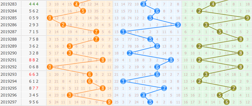 和值预测:上期和值开出20,大和值出现,近期的和值出号位置左右振幅比较大,后期大家可以重点关注中小和值,本期具体推荐和值:10 14 15 18