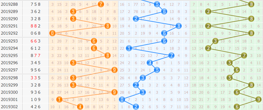 ③012路分析:为0路出1个,1路出1个,2路出1个;本期看好0路球出号,关注6码,综合分析看好020 010路组合出号。