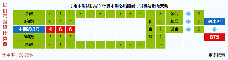本期3d试机号胆码计算器给出结果:875