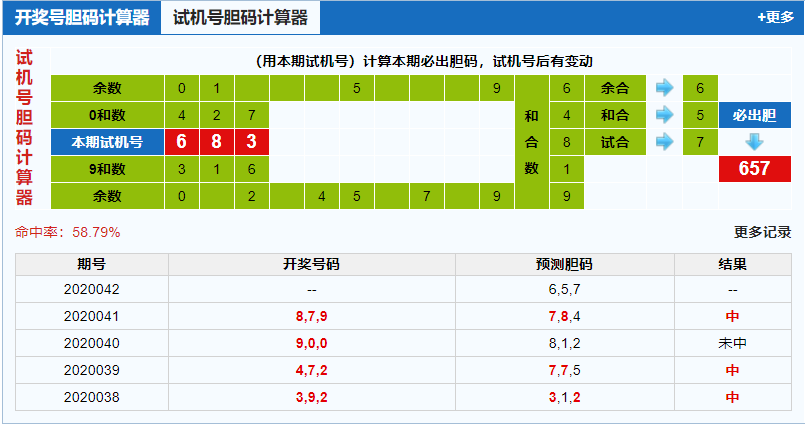 今晚的试机号开出了组六形态683,两大一小组合,两偶一奇组合,和值开出17,跨度开出5,020路号码。参考近期的试机号开奖号码走势图分析, 今晚的试机号出号位置小幅度往左边扩散,其中两个大号刚好也是试机号重复号,看来今晚的大号走势大家需要重点关注一下了,目前出号位置还是比较靠右的,建议重点设防。本期试机号胆码计算器胆码推荐:657,依旧是大号为主,本期大家可以重点关注一下大号组合。最近的试机号胆码计算器命中率比较高,今晚命中一个的概率也是比较大的,建议大家可以重点关注一下号码7,本期作为重复号需要大家重点关注。