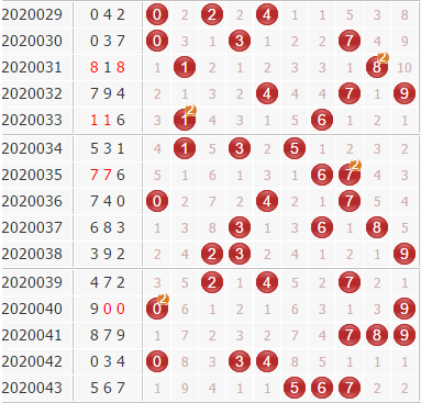 上期开出201路号码,近期号码路数三路的号码都有积极的表现,其中这几期0路最为活跃,在近5期内有券0路的出现,也有0路的同路号出现,本期0路的热度预计还未完全褪去,同时2路号在近期一直默不作声起到辅助作用,在本期要防范2路走热。