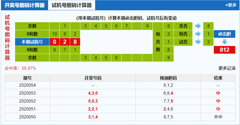 今晚的试机号开出了组六形态028,两小一大组合,全偶组合,和值开出08,跨度开出08,022路号码。参考近期的试机号开奖号码走势图分析,今晚试机号开出三个都是偶数号码,其中号码0和号码8近期的走势都是比较热门的,今晚建议大家可以重点关注出号位置分散出现,小防一下奇数号码出现。本期试机号胆码计算器胆码推荐:812,近期的试机号胆码计算器连续三期命中,本期大家其实也是可以小防一下的。这里推荐的两个小号是连号组合,刚好也都是本期的邻码走势,本期出现几率比较高,建议今晚大家可以重点设防。