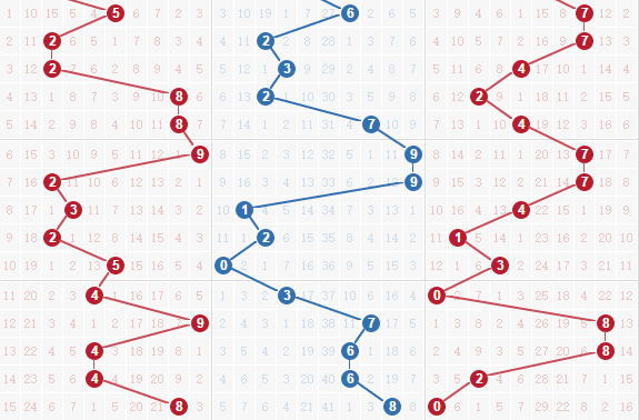 【和值分析】:和值上期开出了16,现在和值明显是上升趋势的,而且近期和值也是稳定在中大和值区里面的,本期也要看好和值的走大。