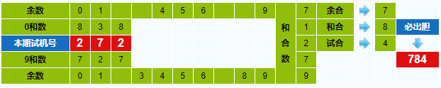 本期胆码计算器与试机号没有重合的号码。结合近期试机号命中开奖号走势图来看,试机号命中开奖号的概率保持稳定,大致间隔0~1期命中一个号码,上期试机号有命中一码,本期继续命中的概率比较大,可以着重关注一下试机号的两个号码。