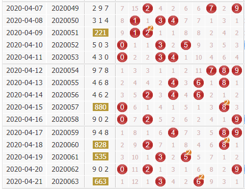 063期开奖号是663 663*3.14=2081.82,胆码看028,独胆看0