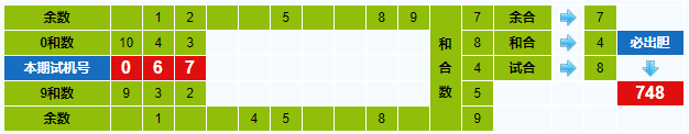本期胆码计算器与试机号重合一码7,。结合近期试机号命中开奖号走势图来看,近期命中的试机号大多集中于小号,大号则相对较少,而且7号球为近期冷号,在近三十期内都没有试机号7命中开奖号7的记录。本期7号球看冷。