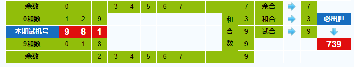 本期胆码计算器与试机号重合了9号球。结合近期试机号命中开奖号走势图来看,近期9号球出现在试机号中的几率上升,本次开出已经是近五期第三次在试机号中出现。随着9号球复出的苗头越来越大,本期建议多加关注9号球。
