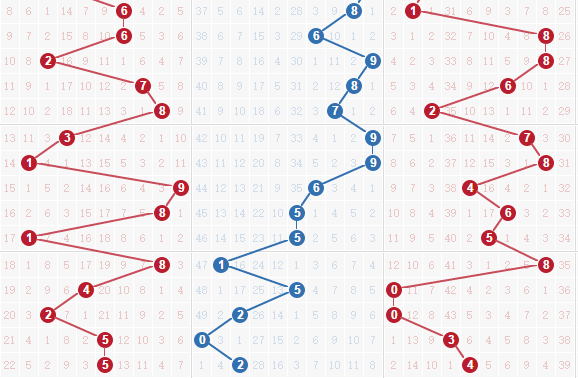 个位分析:个位上是1路号码开出,1路号码和0路号码开出是最多的,本期也要重点看好0路号码,可以小防1路号码。