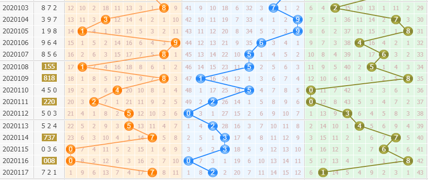 和值预测:上期和值开出10,上期和值小幅度右移。近期的和值走势都是比较集中在走势图靠左位置,后期大家可以重点关注一下出号位置大幅度右移,本期重点推荐和值范围:11—17
