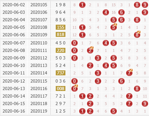 上期的3d开奖号码是125,开出了小小大,奇偶奇,和值是8,和尾是8,开出了组六,目前组六是连续开出了3期,本期继续看好组六的开出,近期组六预计会连续开出来。上期开出了一个重复号,近期重复号需要重点关注,预计会开出1-2个。