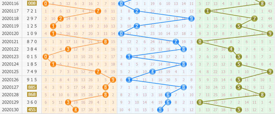 跨度预测:上期跨度开出01,小号奇数跨度出现,近期跨度走势变动比较大,后期大家可以重点关注出号跨度小幅度右移,苏会文本期参考号码走势分析,重点推荐本期跨度范围:3—7