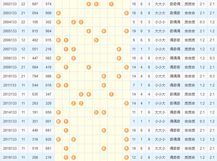 类型分析:在第133期历史同期开奖中,18期里开出了2期的组三,分别是第2003133期、2015133期,剩下的都开出了组六,也就是说组三走低,组六大热,在第133期中预计会持续开出组六,所以本期第2020133期关注组六的开出。