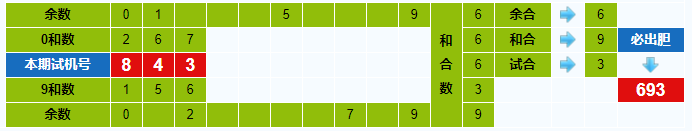 本期胆码计算器与试机号重合一码3。结合近期试机号命中开奖号走势图来看,3号球近期出现在试机号的几率非常大,近十期中还出现过一次连续三期的情况。而且,3号球还是本期隔期号,近期热度上升非常明显,是一个必须关注的号码。